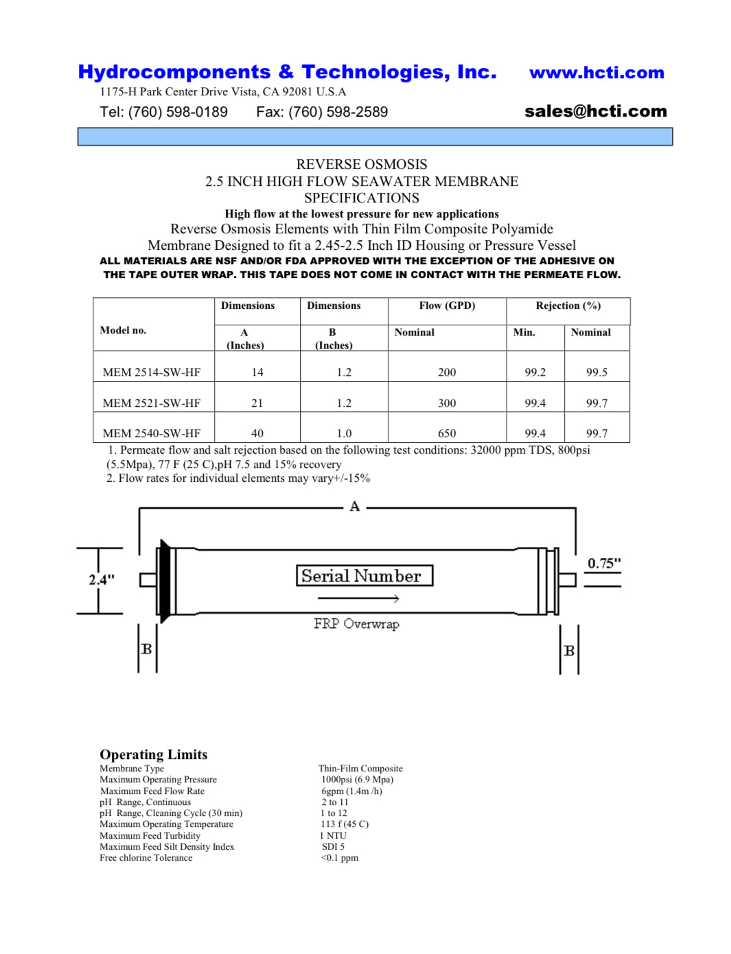 - Permeate flow and salt rejection based on the following test conditions: 32000 ppm TDS, 800psi (5.5Mpa), 77 F (25 C),pH 7.5 and 15% recovery