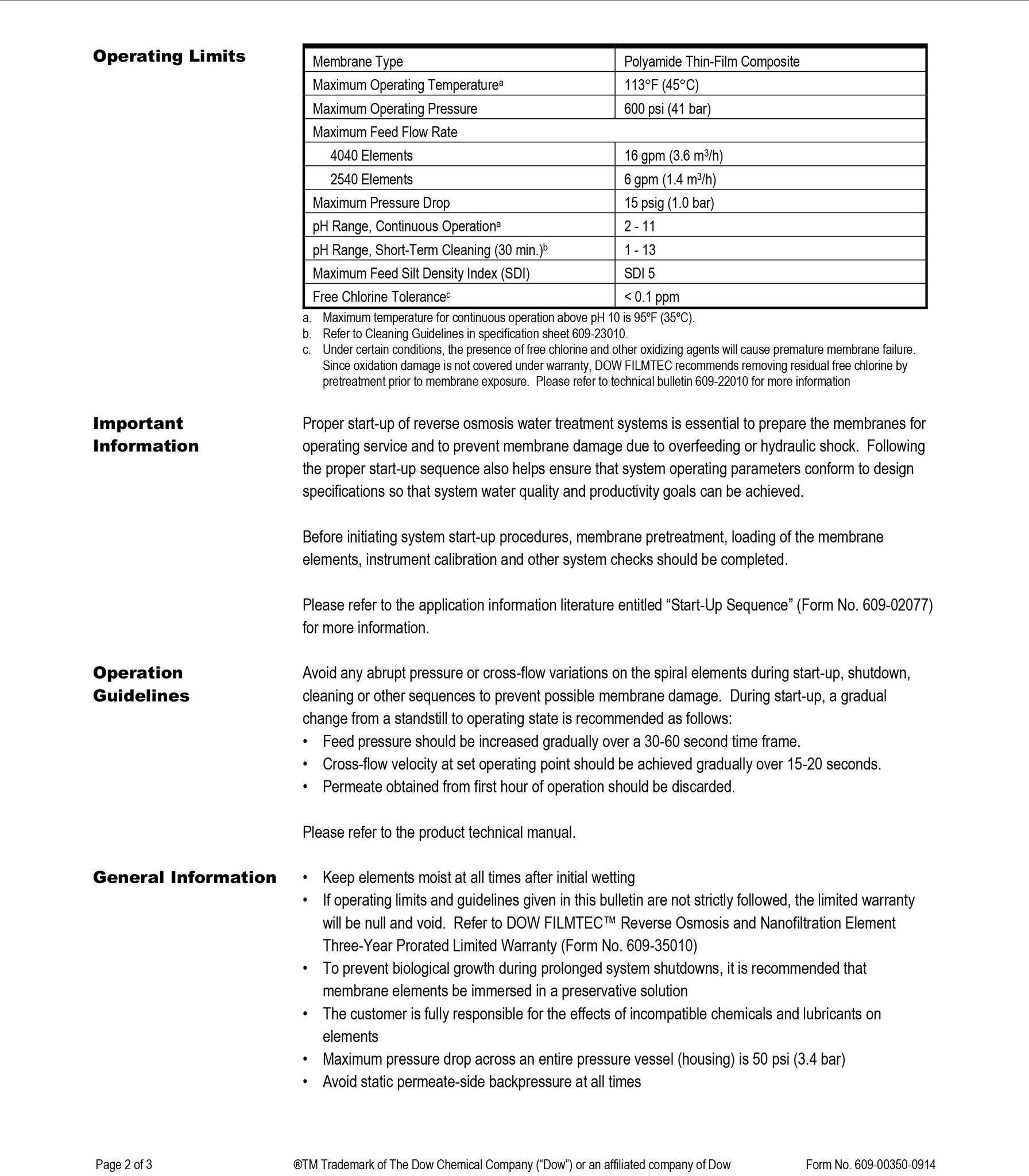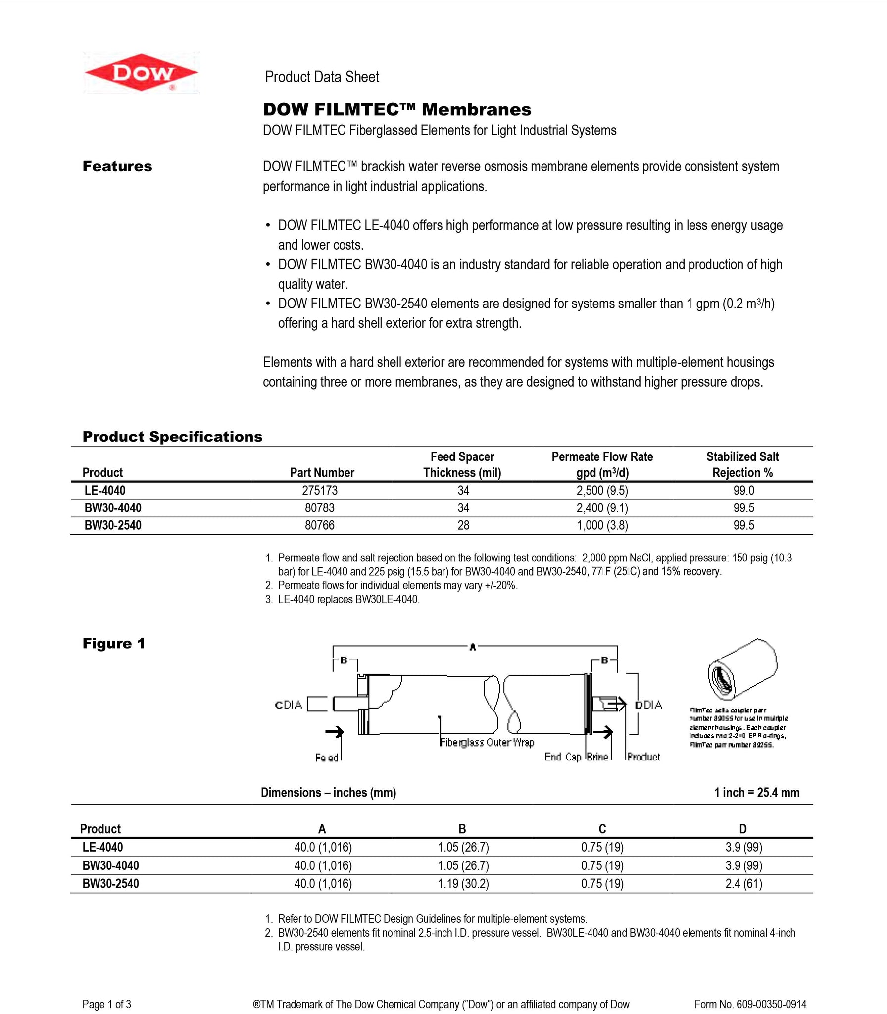 BW30-2540 FilmTec™ DOW / DuPont 225 PSI 1000 GPD 2.5 x 40 membranes
