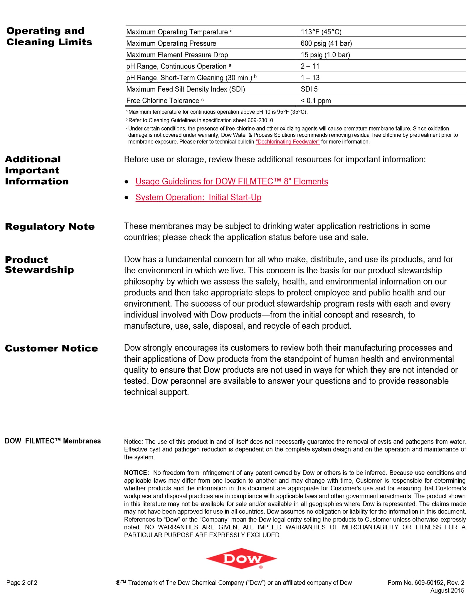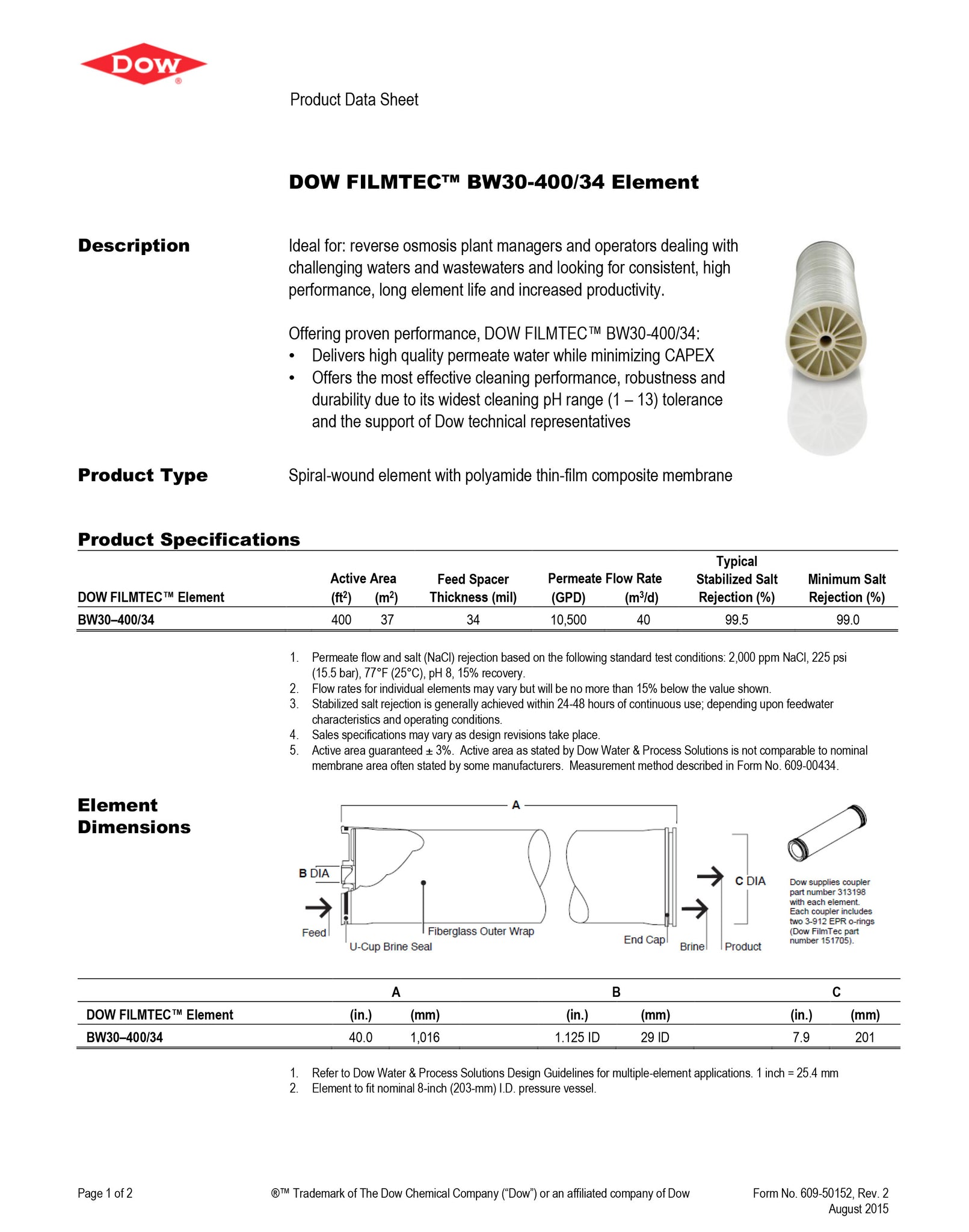 Utilizing FilmTec's advanced polyamide thin-film composite chemistry, the BW30-400/34 delivers superior performance, achieving a high nominal salt rejection of 99.5% for brackish water sources. The element maintains high productivity, offering a nominal permeate flow of 10,000 GPD, making it a powerful solution for commercial and industrial water treatment despite its reduced size.