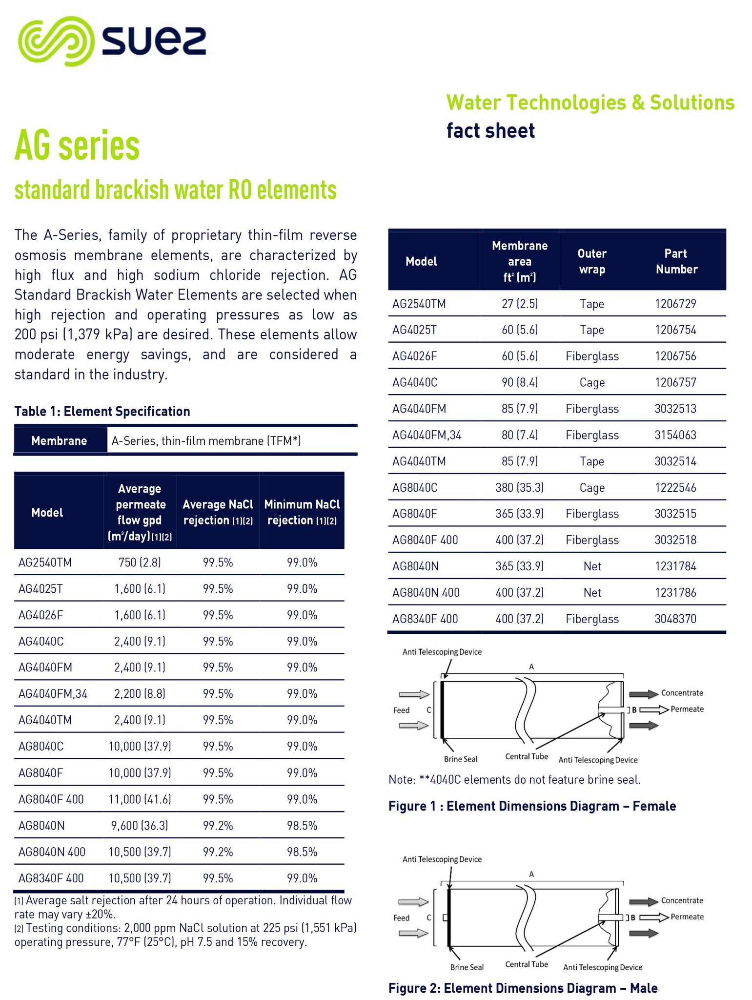 The AG 8040F-400 is a premier 8-inch (8040) Reverse Osmosis (RO) element from Veolia Water Technologies & Solutions (formerly Suez and GE Water). Designed for demanding industrial and commercial applications, this membrane delivers exceptional rejection and high permeate flow at standard low operating pressures.