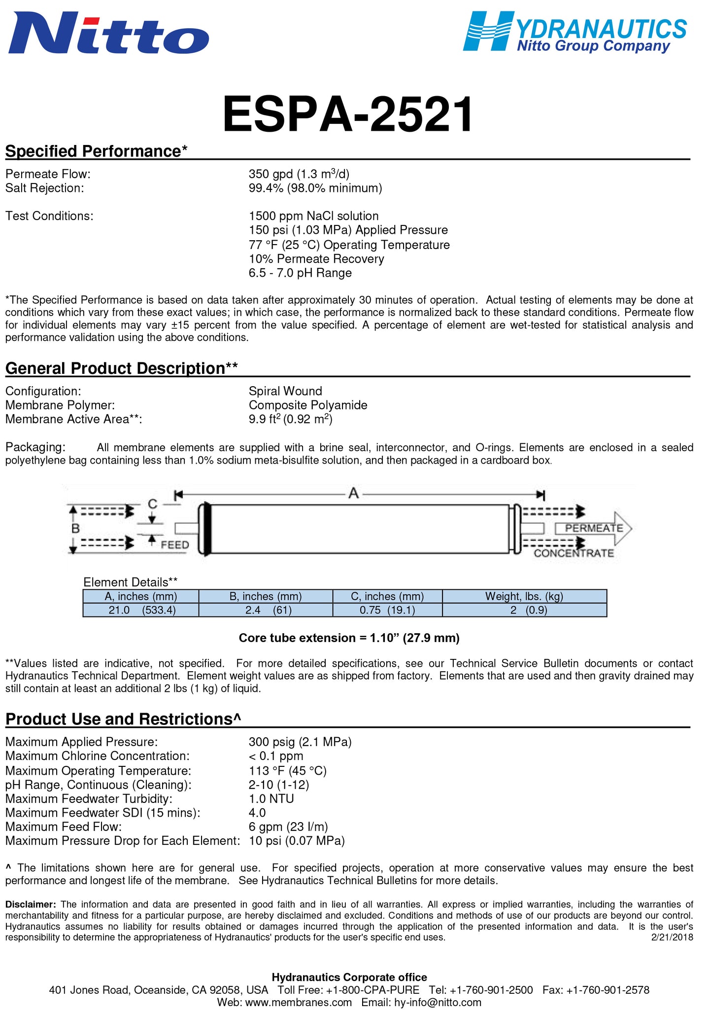 ESPA-2521 Hydranautics / Nitto Membranes 150 PSI 350 GPD 2.5 x 21 inch High Productivity Low Pressure Membranes