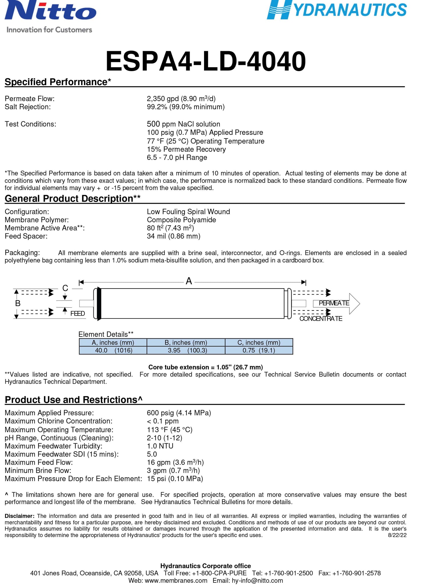 The Hydranautics ESPA4-LD-4040 is a professional-grade 4-inch by 40-inch Reverse Osmosis (RO) element from the acclaimed Energy-Saving Polyamide (ESPA) series. Manufactured by Hydranautics (a Nitto Group Company), this low-energy membrane is specifically designed for brackish water and industrial applications where achieving high salt rejection at ultra-low operating pressures is crucial.