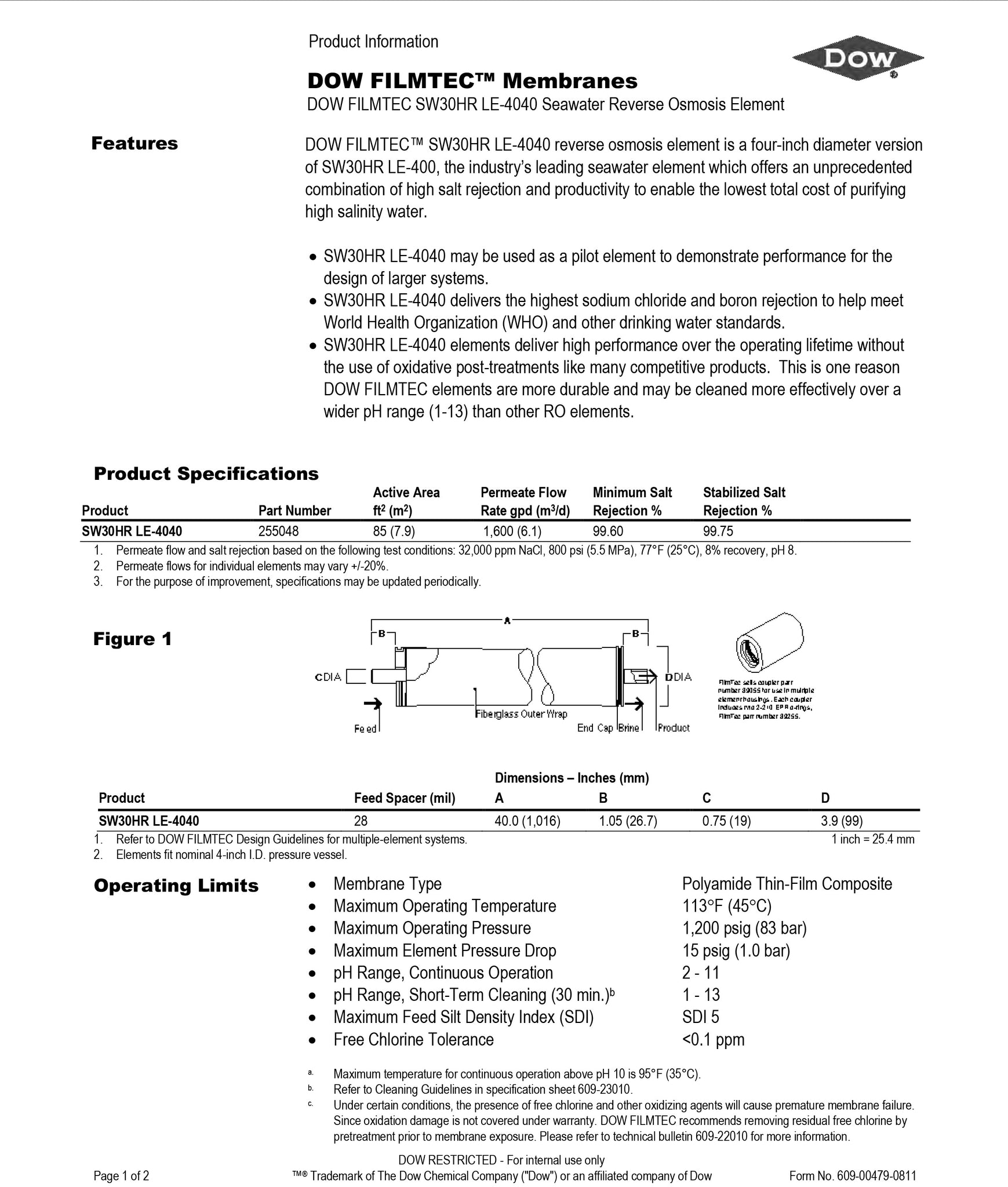 The FilmTec™ SW30HRLE-4040 is a premium, high-rejection Seawater Reverse Osmosis (SWRO) membrane element designed to deliver superior water quality while maintaining high energy efficiency. As a 4-inch diameter version of the industry-leading SW30HRLE-400, this element is specifically engineered for medium-sized desalination systems, providing a reliable source of high-purity drinking water from high-salinity feed sources.