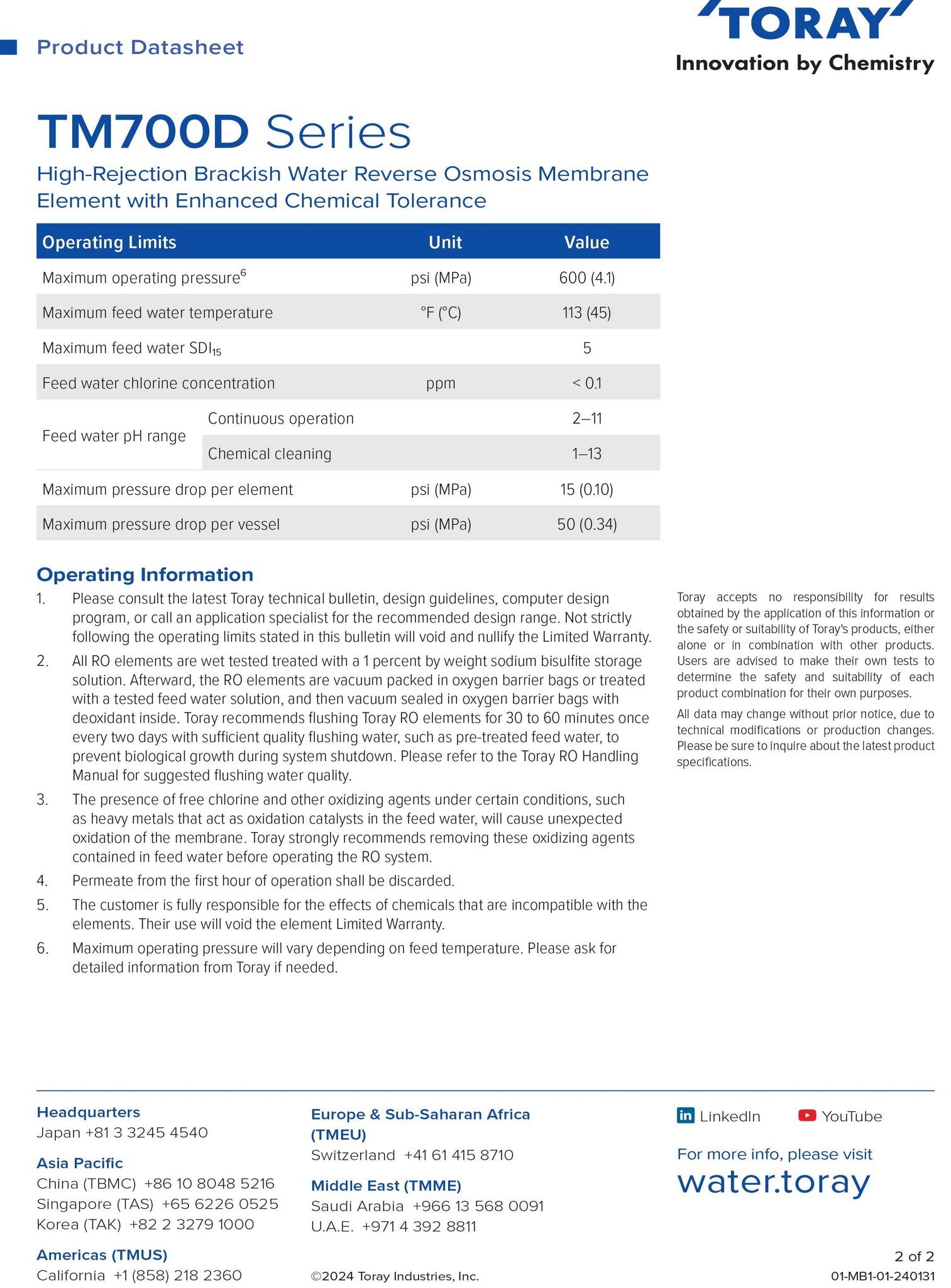 Operating efficiently at a low applied pressure of 225 PSI, the TM710D delivers a high permeate flow rate of up to 2,600 Gallons Per Day (GPD). With a maximum operating pressure of 600 PSI, it offers reliable performance and a long service life while reducing overall energy costs.