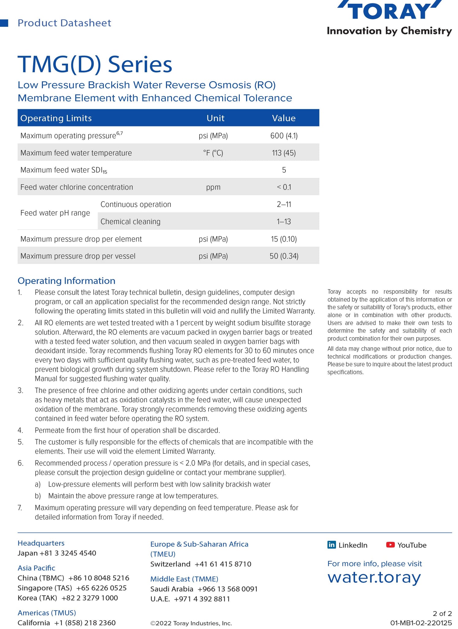 TORAY TMG20D-400 (Low Pressure Brackish Water RO Membrane)
