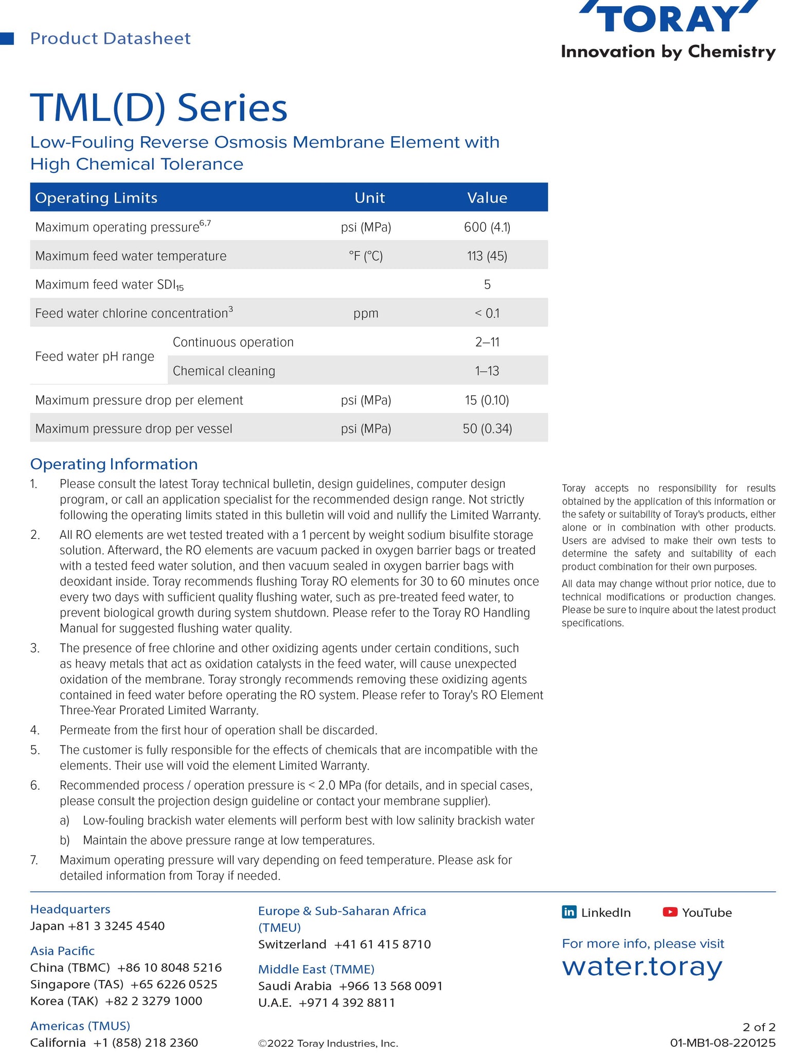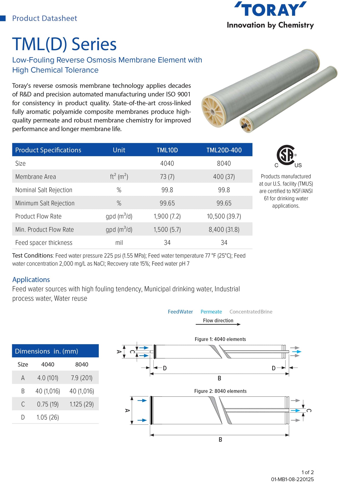 The TORAY TML20D-400 is a standard 8-inch Reverse Osmosis (RO) element specifically engineered for treating low salinity brackish water and municipal water sources. Part of the TML (Toray Low Pressure Municipal) series, this element is optimized for excellent performance at ultra-low operating pressures, which drastically reduces energy consumption and operational costs.