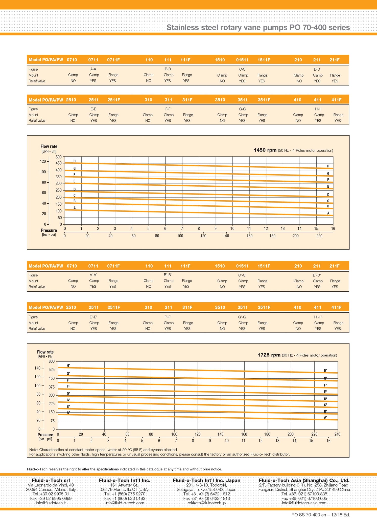 The PO 70-400 series positive displacement rotary vane pumps are available with brass or stainless steel housings with 3/8” GAS or NPT ports and internal relief valve. The nominal flow rates range between 70 and 400 l/h at 1450 rpm. Any vane pump of this series may be operated at 1725 rpm as well and will provide about 20% more capacity, with a maximum of 530 l/h. Maximum discharge pressure is 16 bar (230 psi). This series mounts directly to NEMA 48Y motors by means of a v-band clamp and to M71, M80 IEC and NEMA 56C motors by means of an adapter and relevant coupling.