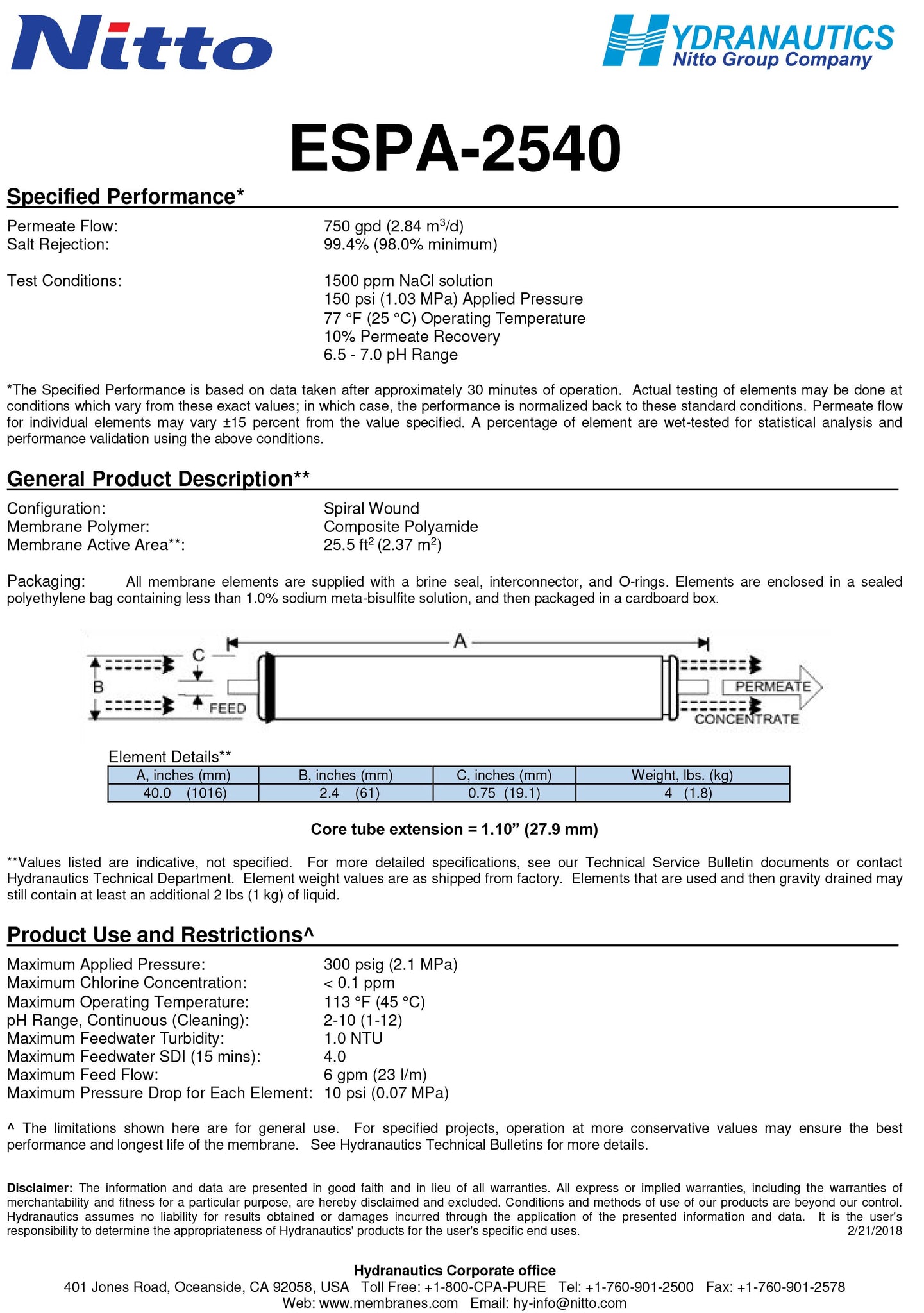 ESPA-2540 Hidráulica / Nitto Membranas 150 PSI 750 GPD 2,5 x 40 pulgadas