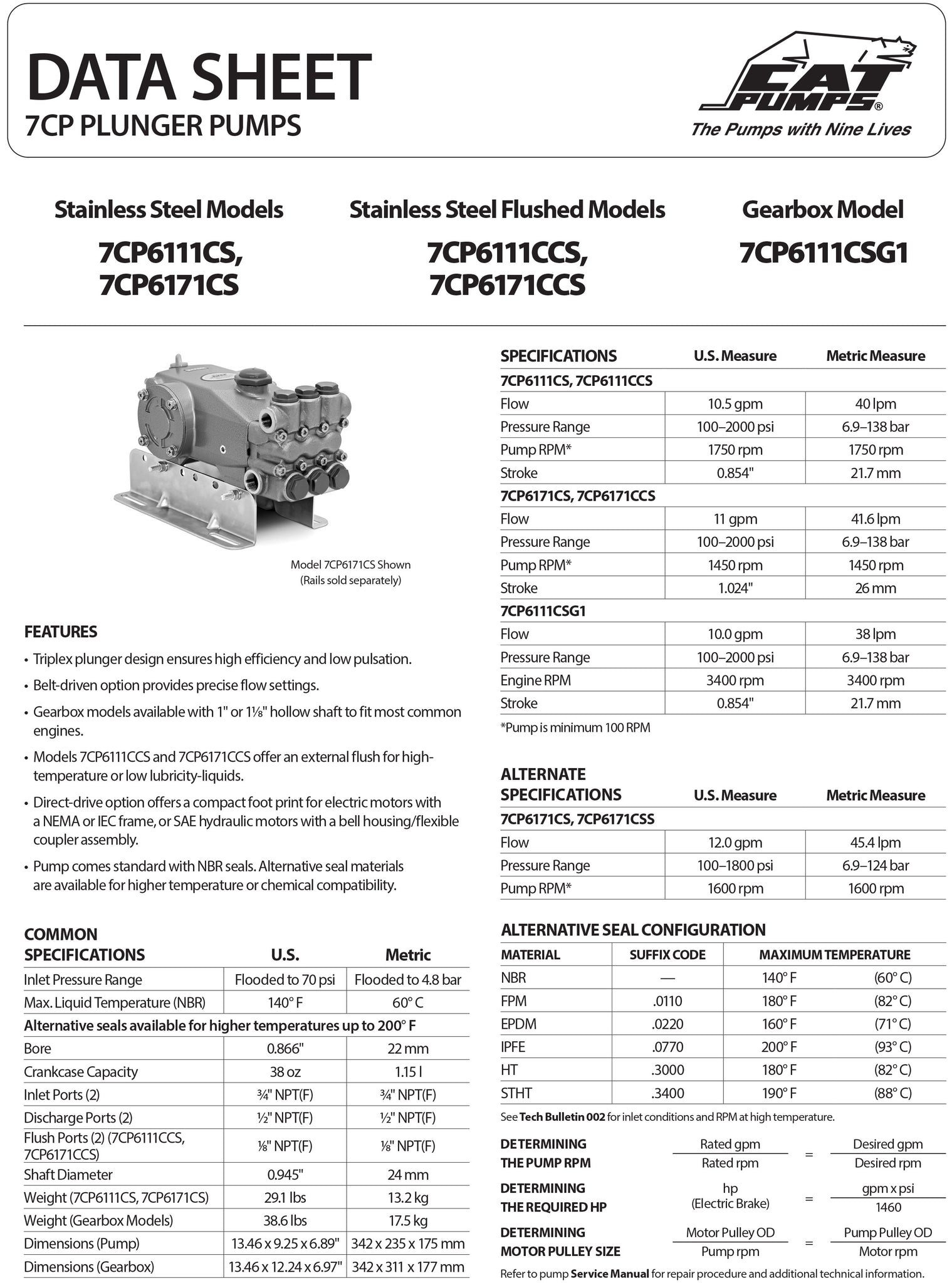 7CP6171RS CAT Triplex Positive Displacement Plunger Pump , 7-Frame Compact Series , Chemical / Sanitary 316 Stainless Steel , 11/2000 ,12/1800